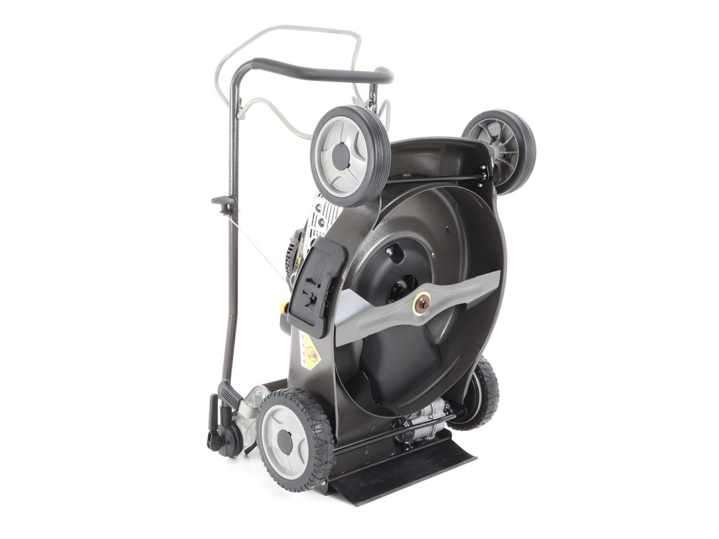 Výhoudou sekačky je funkce tzv. "CHYTRÉ ŘEŠENÍ", sekačku lze pro ekonomické uskladnění, snadné čištění, servisování otočit a postavit na zadní speciální patky šasi, tímto se snadno dostanete na spodní část žacího ústrojí, uložení náprav a převodovku.