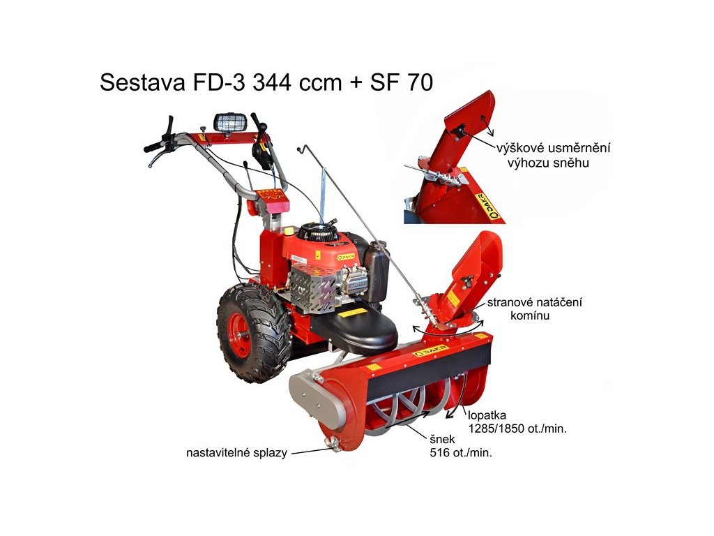 Adaptér se záběrem 69 cm je určen především k odklízení čerstvě napadaného sněhu, ale zvládne i přemrzlý sníh. Naše sněhová fréza má pomaloběžný šnek i rychleběžnou lopatku v jedné ose, což přináší zkrácení stroje a tedy lepší manipulovatelnost. Díky nastavitelným otáčkám lopatky můžete navíc optimálně upravovat parametry stroje. Pro lehkký sníh nastavíte rychlejší otáčky lopatky a tím zvýšíte délku odhozu, u těžkého sněhu otáčky snížíme a šetříme tím výkon motoru. Vyletující sníh lze odhazovat prakticky kamkoliv před nebo vedle stroje díky natáčecímu komínku. Adaptér doporučujeme osazovat na pohonné jednotky se zpátečkou (FD-2H, FD-3). Sněhová fréza lze agregovat také spolu s pohonnou jednotkou FD-5.
