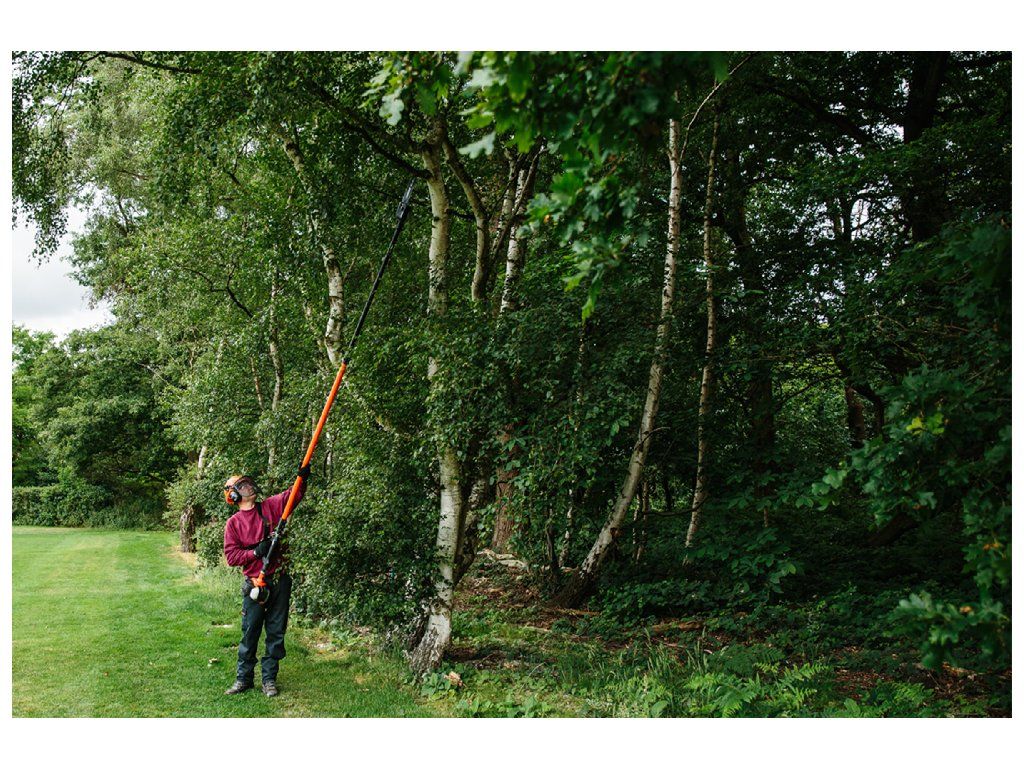 Velmi pevná teleskopická tyč s nově navrženou jednodílnou spojkou usnadňuje prořezávání větví mimo váš dosah.