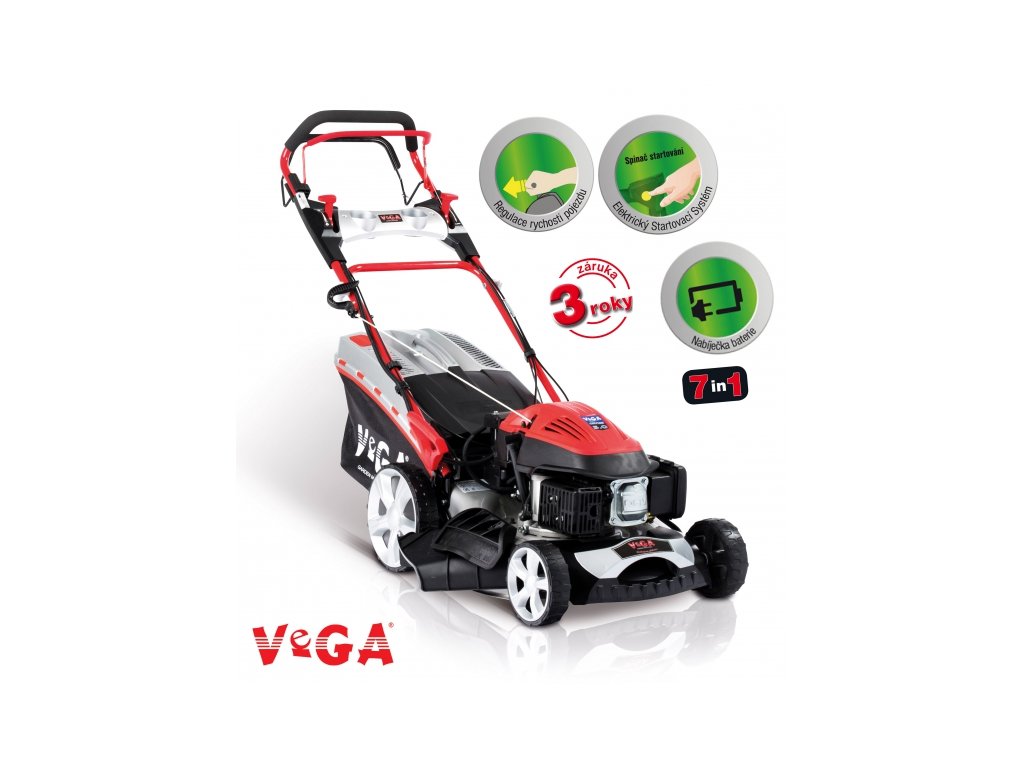 Zahradní benzínová sekačka s pojezdem, s jednoduchou obsluhou a motorem VeGA. Střední třída sekaček s kvalitním zpracováním, výbavou a stejně tak i designem. Univerzální sekačka s vysokou kapacitou sekání a je určena na středně velké travnaté plochy. Její funkce 6 in 1 znamená, že umí sbírat posečenou trávu do koše, mulčuje, a nebo může vyhazovat trávu bočním deflektorem i zadním deflektorem ven. Tyto poslední funkce se používají převážně na přerostlou trávu. Komfortem je i elektrické bateriové startování. Variabilní nastavení rychlosti pojezdu dané silným motorem od 3.0-4.0 km/hod. Zahradní sekačka VeGA je vybavena robustním ocelovým skeletem.