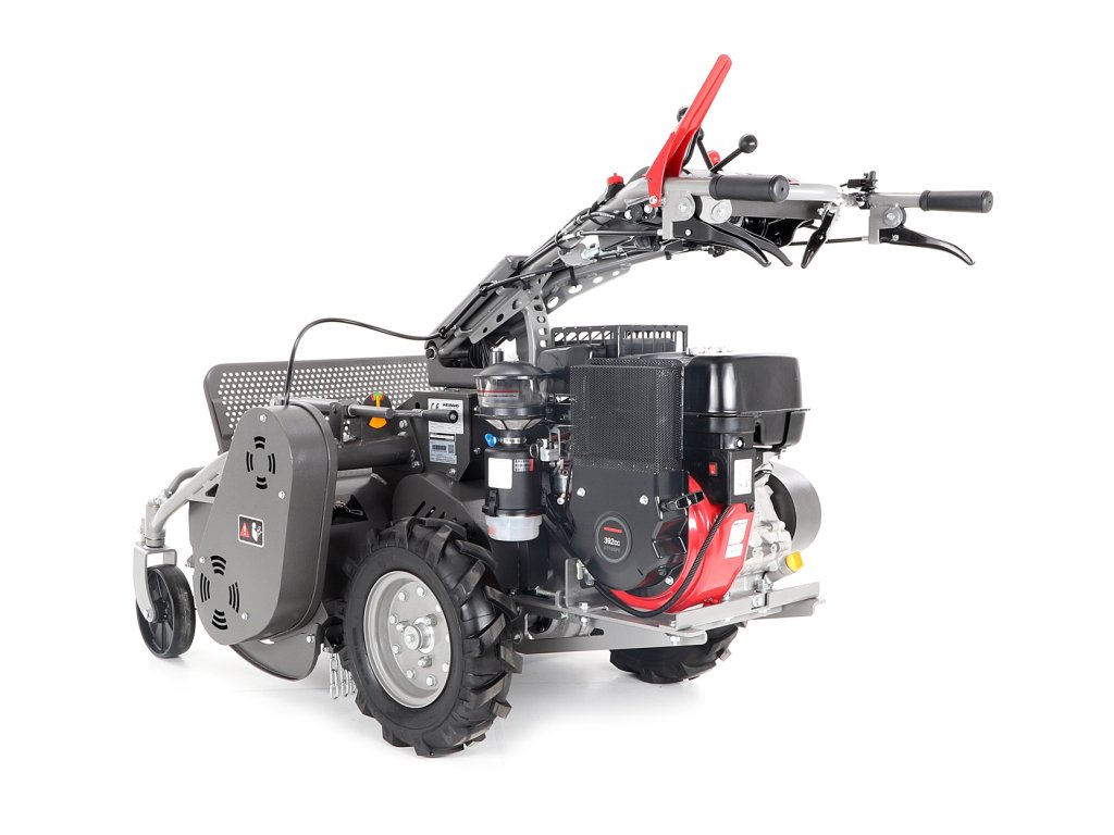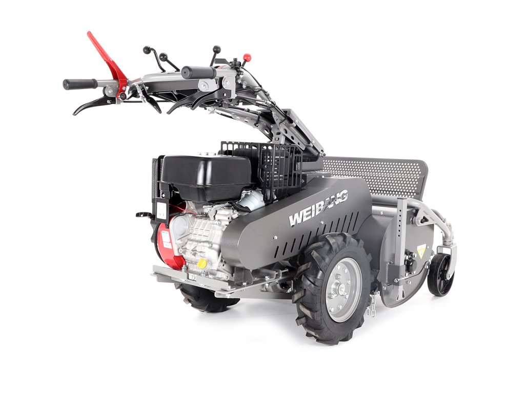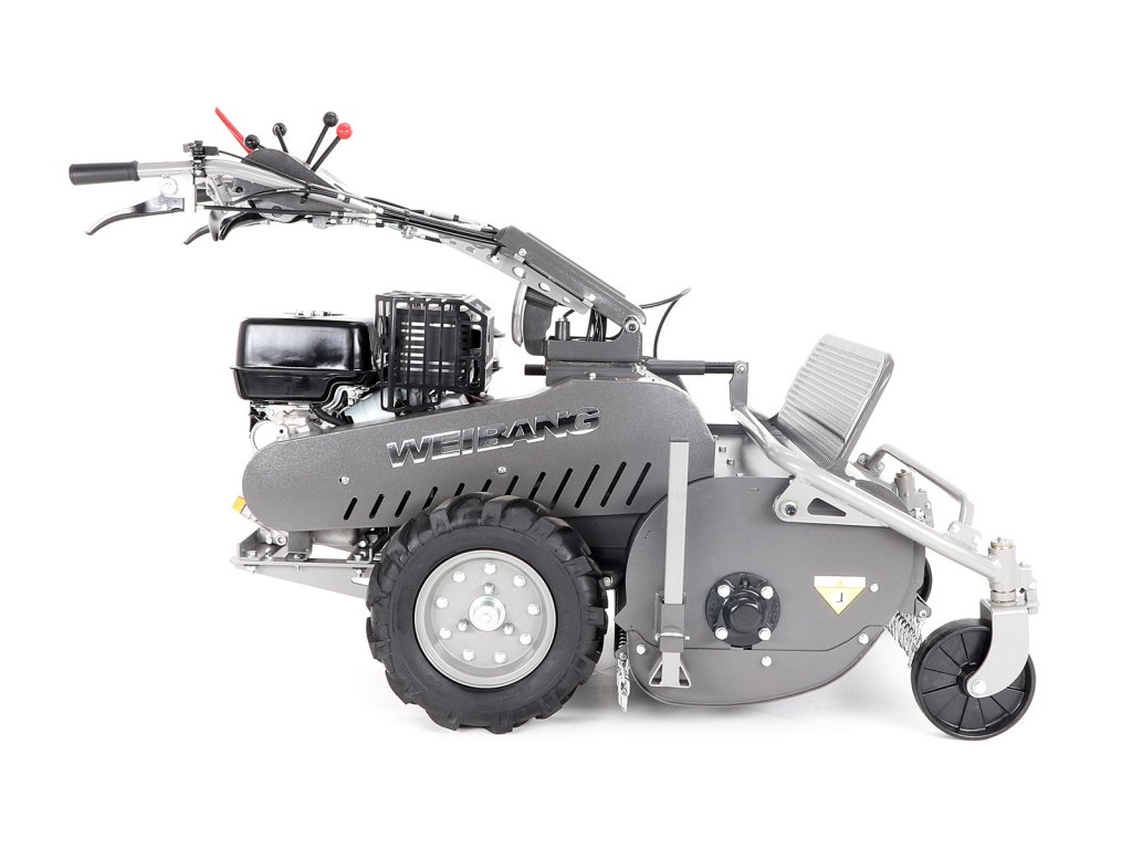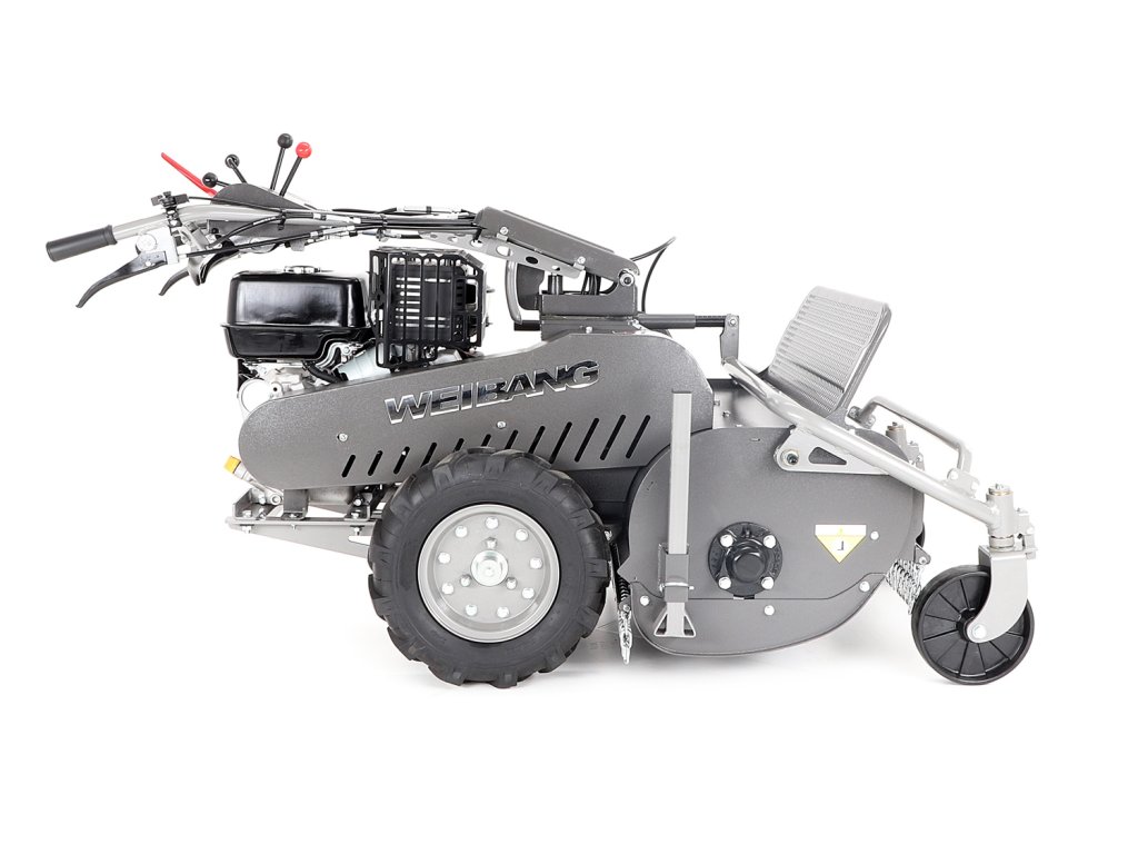Snadný pohyb v terénu usnadní nejen kola s hrubým dezénem, ale i pojezd s CVT Weibang převodovkou. Přední kola uložená na otočných čepech dávají sekačce skvělou manévrovatelnost.