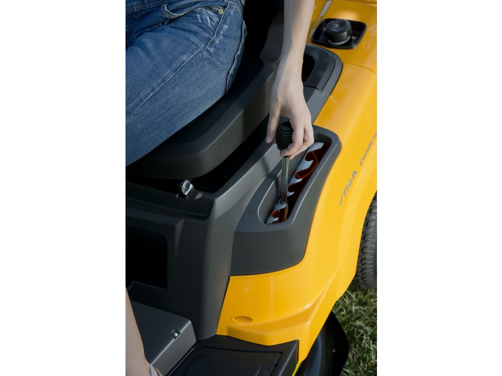 Traktor STIGA Combi 372 kombinuje šířku záběru pouhých 72 cm s pákovou hydrostatickou převodovkou, která zajišťuje plynulou regulaci rychlosti pojezdu, a je tak skvělou volbou pro zahrady, kde je důležitá vynikající manévrovatelnost a schopnost bezpečně pracovat kolem překážek.